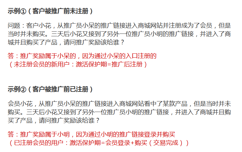 客戶保護(hù)期的定義為“當(dāng)用戶首次進(jìn)入某推廣員的鏈接/二維碼并購買產(chǎn)品或注冊成為會員時,該用戶在指定的保護(hù)期內(nèi)則綁定為該推廣員的客戶,之后無論用戶去到哪里下單(其他推廣員的鏈接或者總店),推廣員都可以得到獎勵;當(dāng)保護(hù)期到期后,用戶再點擊鏈接,則保護(hù)期自動續(xù)期,如保護(hù)期為15天,則續(xù)期15天”。