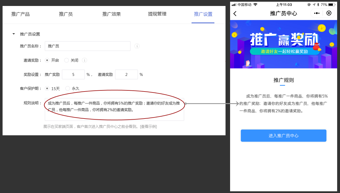 a-4.規(guī)則說明:可自定義推廣員的推廣規(guī)則,規(guī)則將會展示在買家端頁面,當(dāng)客戶首次進(jìn)入推廣員中心之前會看到。