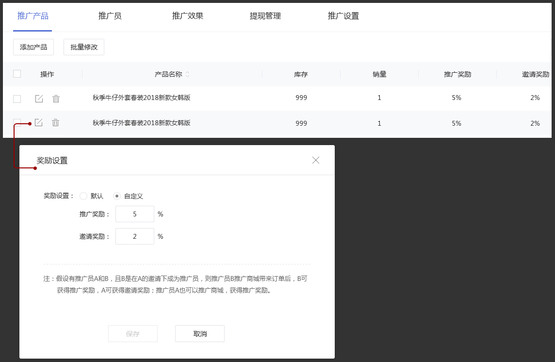 ③點擊“推廣產(chǎn)品”標(biāo)簽項,您可自行添加參與推廣的活動產(chǎn)品。添加推廣產(chǎn)品后,您可自定義其推廣獎勵和邀請獎勵的百分比,也可以選擇默認(rèn)獎勵。參與推廣的活動產(chǎn)品的產(chǎn)品詳情頁會顯示“賺”。