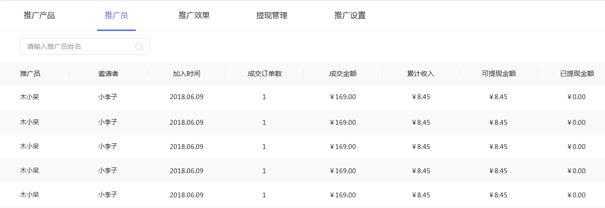 ④點擊“推廣員”標(biāo)簽項,您可在此處查看推廣員列表,每個推廣員會顯示其邀請者、加入時間、成交訂單數(shù)、成交金額、累計收入、可提現(xiàn)金額、已提現(xiàn)金額。