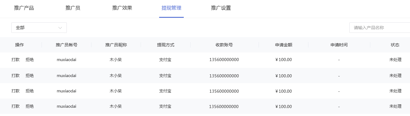 當(dāng)選擇結(jié)算方式為“系統(tǒng)自動結(jié)算”時,商家只需在推廣員發(fā)起獎勵提現(xiàn)時,進(jìn)入“網(wǎng)站管理后臺--營銷--推廣員--提現(xiàn)管理”處點擊【打款】,系統(tǒng)會自動打款到推廣員的提現(xiàn)賬戶?!跋到y(tǒng)自動結(jié)算”支持提現(xiàn)到支付寶和微信零錢,但商家成功使用此結(jié)算方式的前提是:已在網(wǎng)站管理配置微信支付,并在微信支付商戶平臺開通了企業(yè)付款功能;已在網(wǎng)站管理配置支付寶支付,并在支付寶商戶平臺開通了單筆轉(zhuǎn)賬到支付寶功能。