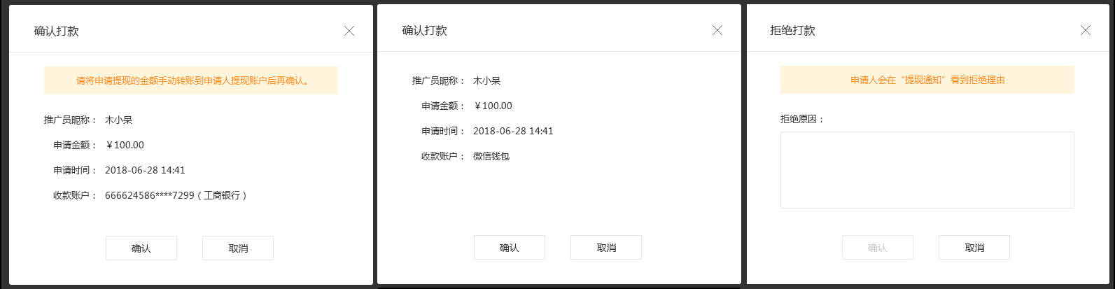 當(dāng)選擇結(jié)算方式為“商家手動結(jié)算”時,商家需要在推廣員發(fā)起獎勵提現(xiàn)時,線下自行打款給推廣員,然后再在系統(tǒng)進(jìn)行線上確認(rèn)【打款】操作。