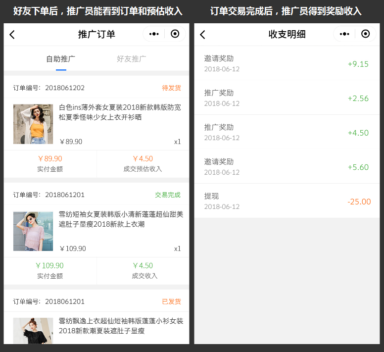 ③好友下單后,推廣員能在“推廣員中心--推廣訂單”中查看訂單和了解預(yù)估收入,訂單交易完成后,得到獎勵收入,在“推廣員中心--收支明細(xì)”中可查看每一筆收支詳情。
