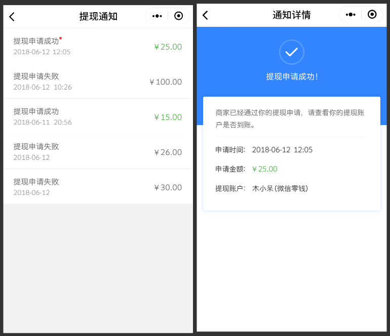 a.當(dāng)商家在后臺選擇提現(xiàn)方式為“系統(tǒng)自動結(jié)算”時,推廣員點擊提現(xiàn)按鈕時會出現(xiàn)提現(xiàn)方式的選擇,可選擇提現(xiàn)至支付寶或微信零錢;當(dāng)選擇微信零錢提現(xiàn)時,需“輕松獲取微信號”。推廣員確認(rèn)提現(xiàn)后,商家需進(jìn)入“網(wǎng)站管理后臺--營銷--推廣員--提現(xiàn)管理”中點擊“打款”,系統(tǒng)會自動打款到推廣員的提現(xiàn)賬戶。推廣員支付寶或微信零錢自動收到錢款的同時,推廣員中心會有一條提現(xiàn)申請成功通知。